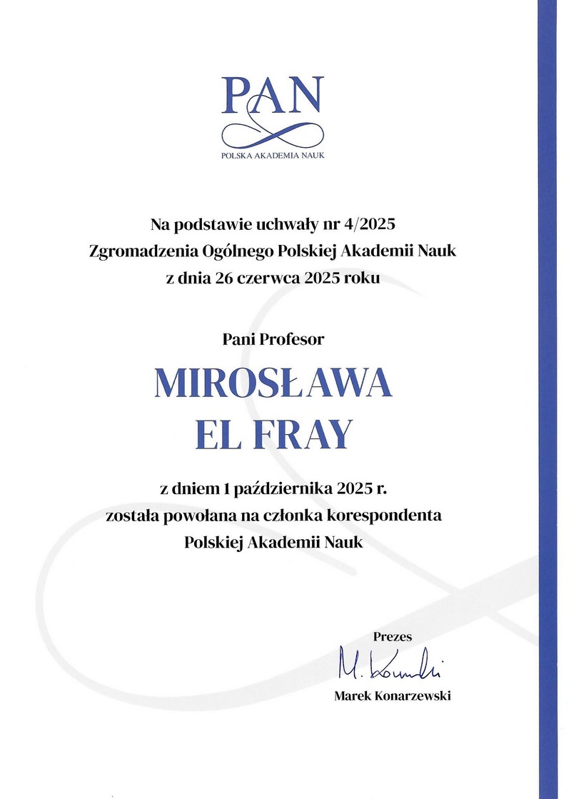 23 października odbyła się uroczystość powołania nowo wybranych członków i członkiń Polskiej Akademii Nauk. Wśród nich znalazła się nasza Koleżanka Prof. dr hab. inż. Mirosława El Fray z Zachodniopomorskiego Uniwersytetu Technologicznego w Szczecinie.